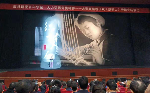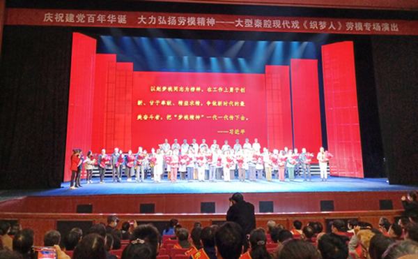 “棉花花白得雪亮,女娃子嫽得攪腸,人已走遠紡車還響,留下這情不老夢還長……”伴隨著深情悠揚、秦聲秦韻的主題歌,建黨百年獻禮劇《織夢人》拉開帷幕。全劇聚焦于新中國成立后西北國棉一廠全國勞動模范、黨的好女兒趙夢桃為代表的紡織工人的先進事跡和輝煌業(yè)績,精心選擇了“為保障抗美援朝戰(zhàn)爭勝利擴臺擴錠”“用竹簽替代花簽練兵”“與小姐妹換‘老虎車’”“為大西北創(chuàng)造名牌”“二十八歲永遠訣別”等動人情節(jié),充分彰顯了在社會主義現(xiàn)代化建設(shè)過程中不斷成長、成熟、成才的人生歷程,表現(xiàn)了一代紡織人聽黨話、跟黨走、報黨恩、分黨憂,從追求“吃飽穿暖”到“衣被天下”的理想之夢、奮斗之歌,首次運用全新的多媒體藝術(shù)表現(xiàn)形式講好勞模故事、陜西故事、咸陽故事。 那些藏在歲月里的一座豐碑和一面旗幟,深深感染著現(xiàn)場每個人。歷時兩個多小時的演出剛結(jié)束,臺下觀眾主動起立,對演員們的辛勤付出和精彩演繹報以熱烈而經(jīng)久不息的掌聲……