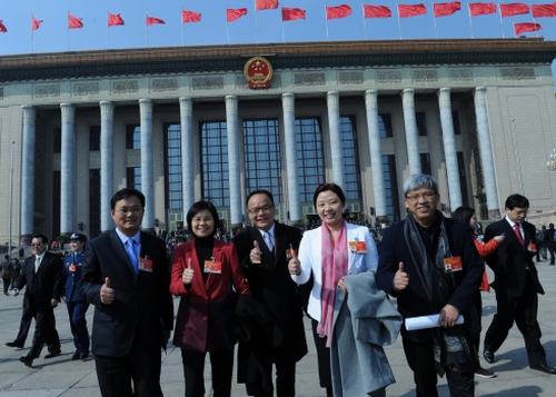 3月5日,在人民大會堂聆聽了《政府工作報告》后,與會的紡織行業(yè)全國人大代表們備受鼓舞,信心滿滿。圖為安徽華茂動力分廠弱電班長吳友勝,江蘇陽光股份有限公司總經(jīng)理陳麗芬,浙江華之毅時尚集團總裁、浙江雅瑩集團董事長張華明,浙江華聯(lián)股份有限公司董事長徐愛華,中國絲綢博物館館長趙豐(從左至右)走出人民大會堂,為政府工作報告點贊。(攝影:徐國營)